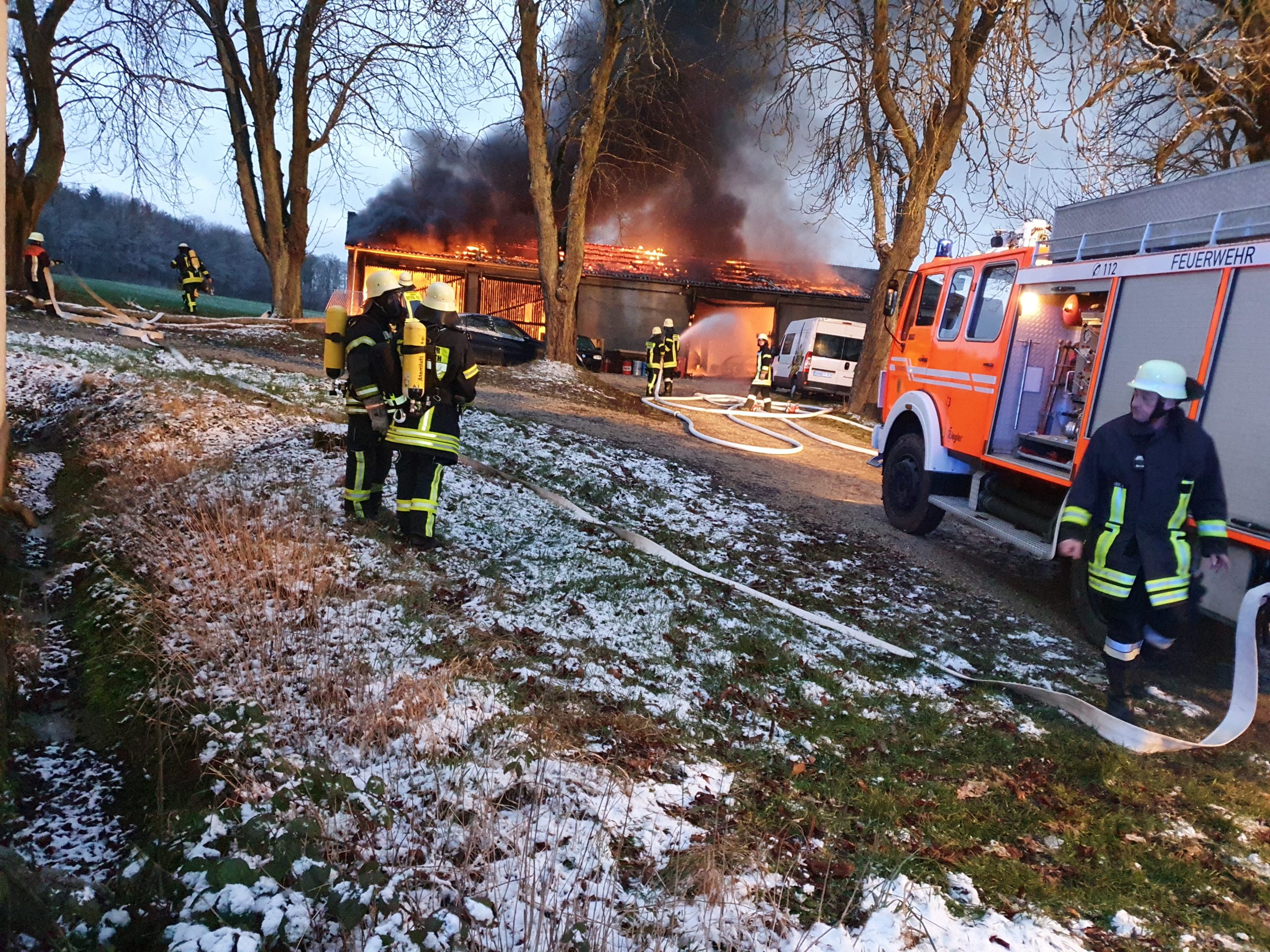 Durch Zugführer Walter Reindl und den beiden Gruppenführern der FF Kaisheim wurden die ersten Einsatzmaßnahmen abgestimmt. Sofort wurde ein Trupp unter schwerem Atemschutz und mit Einsatz der Wärmebildkamera ins Innere des Gebäudes zur Personenrettung und Brandbekämpfung entsandt. Die zweite Gruppe übernahm derweil den Aufbau der Wasserversorgung.
